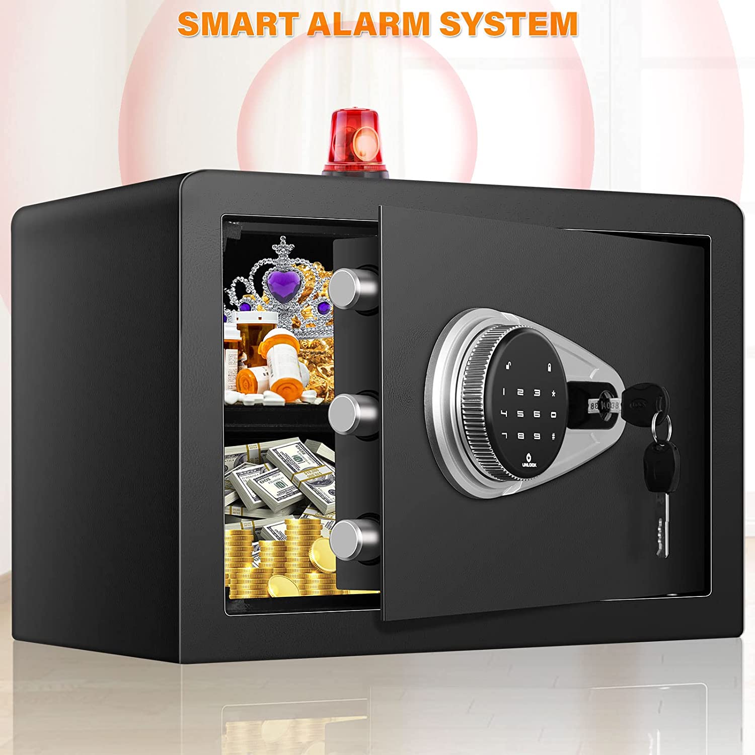 【QUICK ACCESS PERSONAL SAFE】The money safe is equipped with 2 emergency keys and the digital keypad. In case of emergency, you can use the emergency key to open the safe box. The personal safe can be easily programmed with PIN codes. You can set two 3-8 digit PIN codes with long enough digits to reduce random access by curious people through guessing. Equipped with internal LED light, the digital safe box makes it easy for you to see the internal items easily even in the dark.