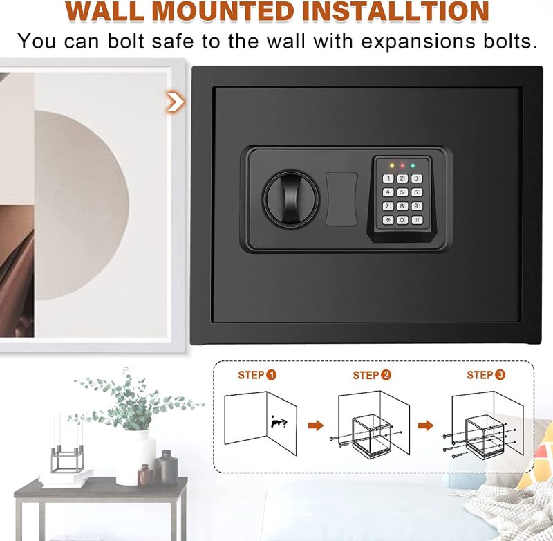 🔥【PREVENT THEFT & ANCHORING DESIGN】This home safe features 2 round live-locking bolts, seamless forming construction, and pry-resistant concealed hinges, provides long-lasting and reliable protection against forced entry. There are 2 pre-drilled holes on the back and bottom of the safe. If you want MORE SECURITY, it can be bolted to the wall or the floor. We have attached expansion screws to make the installation easier.