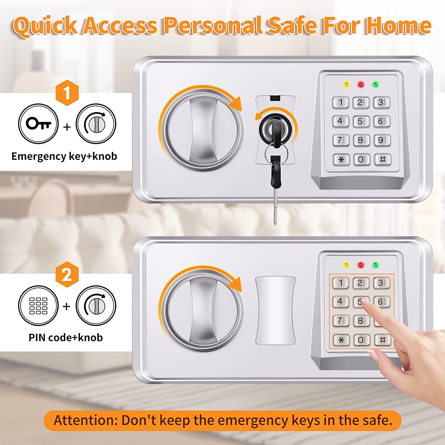 🔥【QUICK ACCESS PERSONAL SAFE】The money safe is equipped with 2 emergency keys and the digital keypad. In case of emergency, you can use the emergency key to open the safe box. The personal safe can be easily programmed with PIN codes. You can set two 3-8 digit PIN codes with long enough digits to reduce random access by curious people through guessing. Equipped with internal LED light, the digital safe box has a good lighting range in case night access is needed.