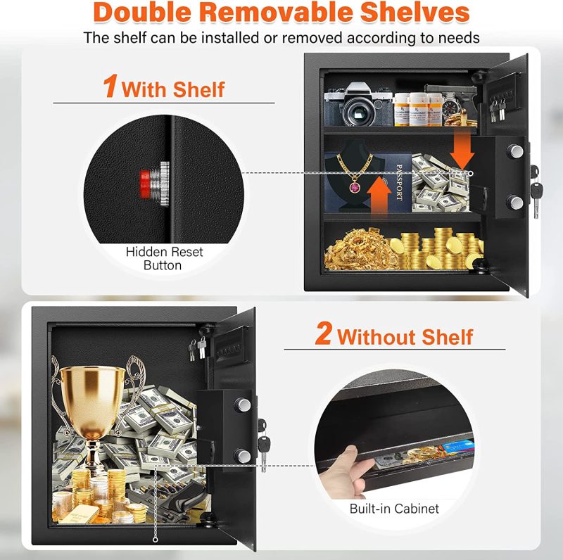 • 🏆【WALL SAFE WITH COMBINATION LOCK】①Emergency key+knob. ②User/master code(3-8 digits)+knob. There are more than 100 million combinations of 3-8 digit codes for the digital safe. No need to worry about curious children making random access by guessing.