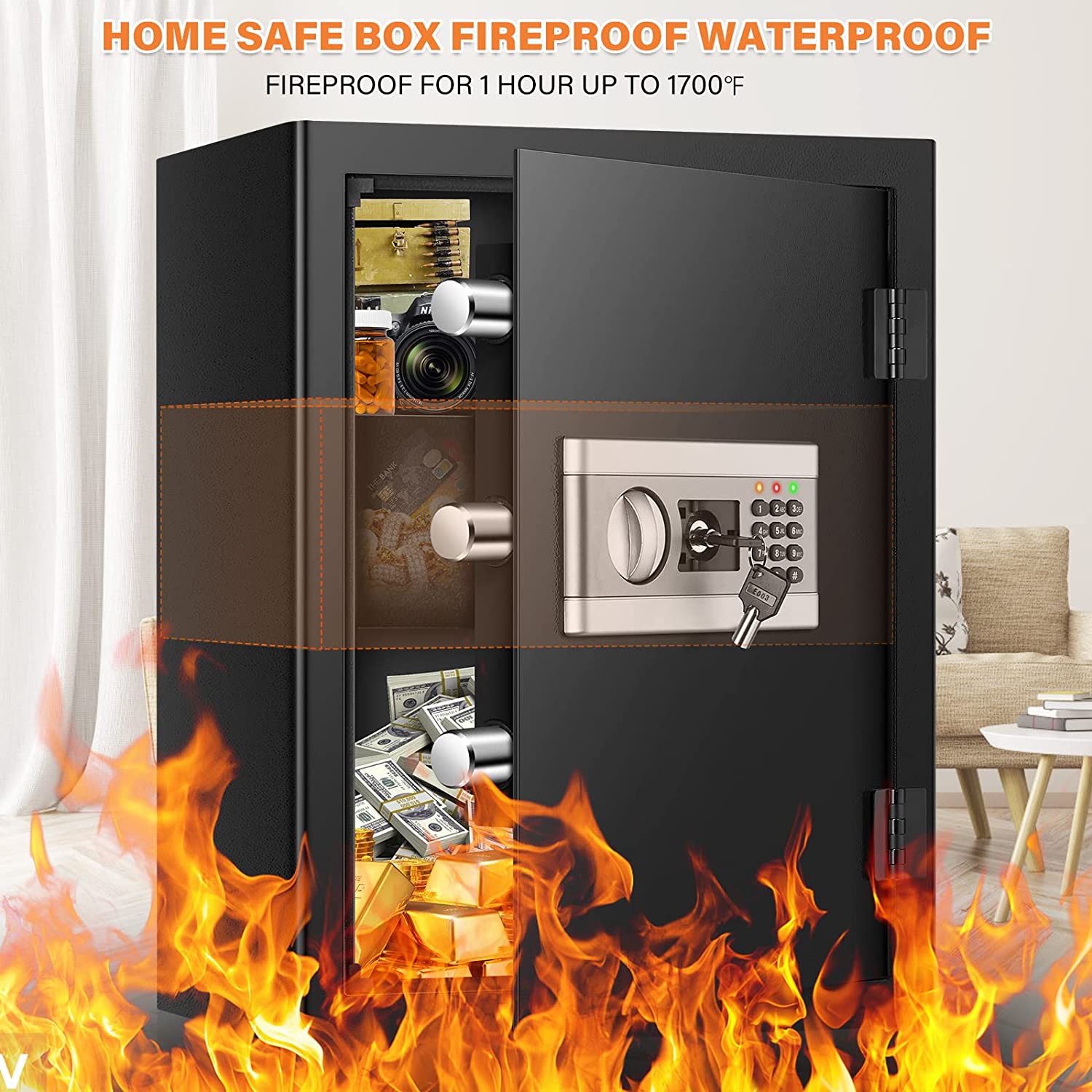 2.3 Cubic Large Safe Box Fireproof Waterproof, Anti-Theft Fire Safe with Digital Keypad Key and Fireproof Lock Box, Personal Security Home Safes for Money Firearm A4 Documents Valuables Medicines