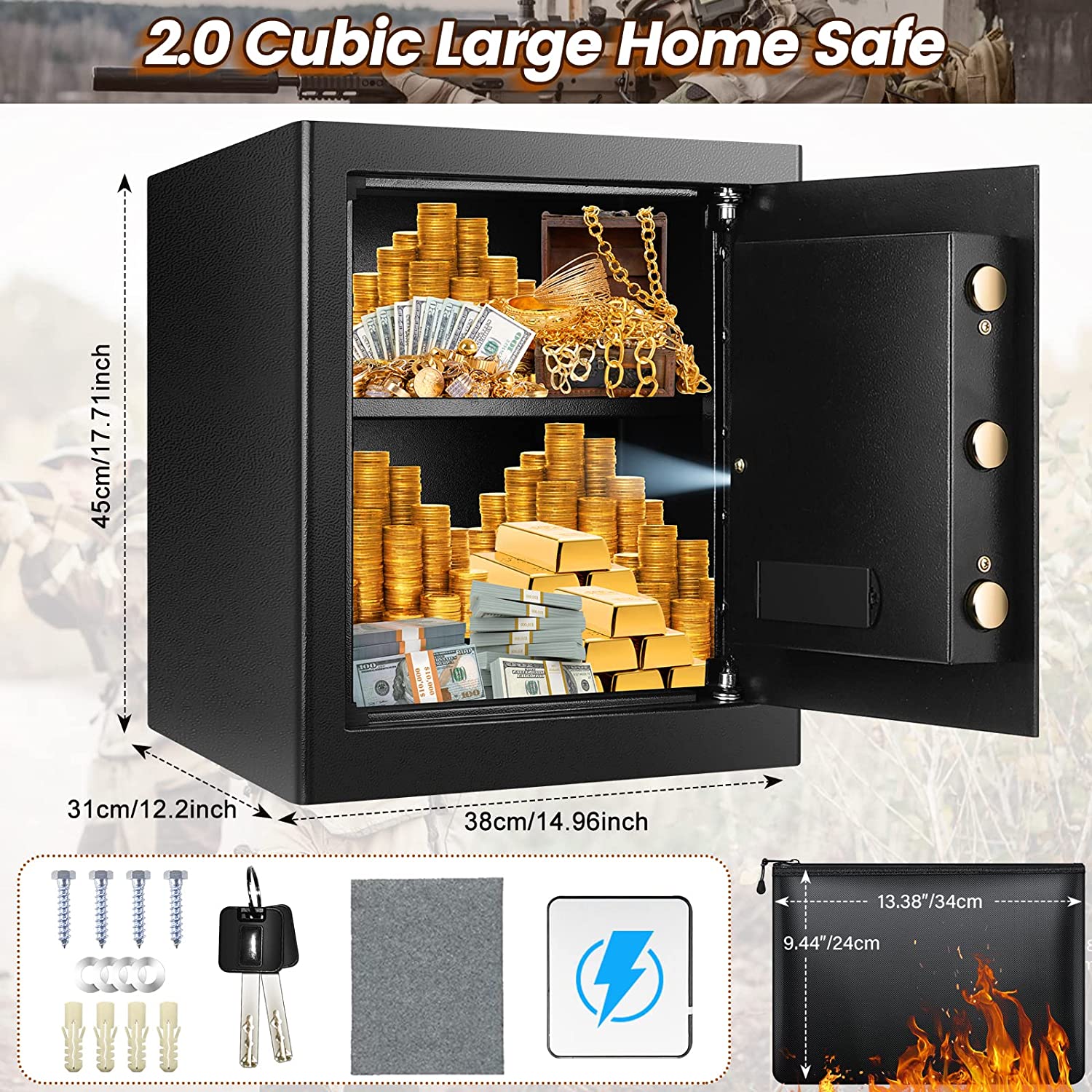 🔥【LIFETIME WARRANTY】You will get one 2.0 Cubic security safe, a fireproof document bag(13.38″×9.44″/34×24cm), two emergency keys, one emergency battery box and mounting bolts. 📞We promise to provide 24-hour online customer service, 365-day unconditional return policy and lifetime warranty service. In case of fire, you can provide the order number and photo for free replacement after fire