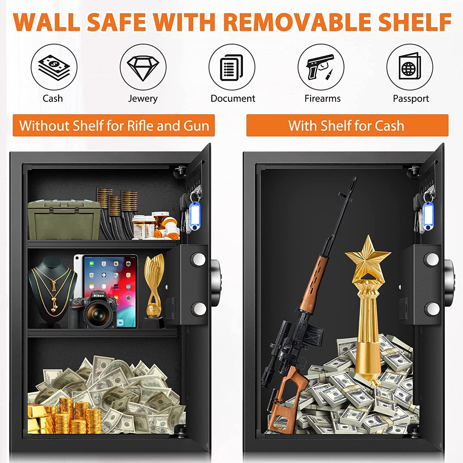 🔥【REMOVEABLE SHELF & “FALSE BOTTOM” ??Fireproof wall safes includes removable shelves and key hooks. You can freely distribute your interior space by the shelves in your safe according to your needs, so as to take advantage of the internal space. The “false bottom” gives you a more secret safe space to provide double security for your money, pistol or anyother items.