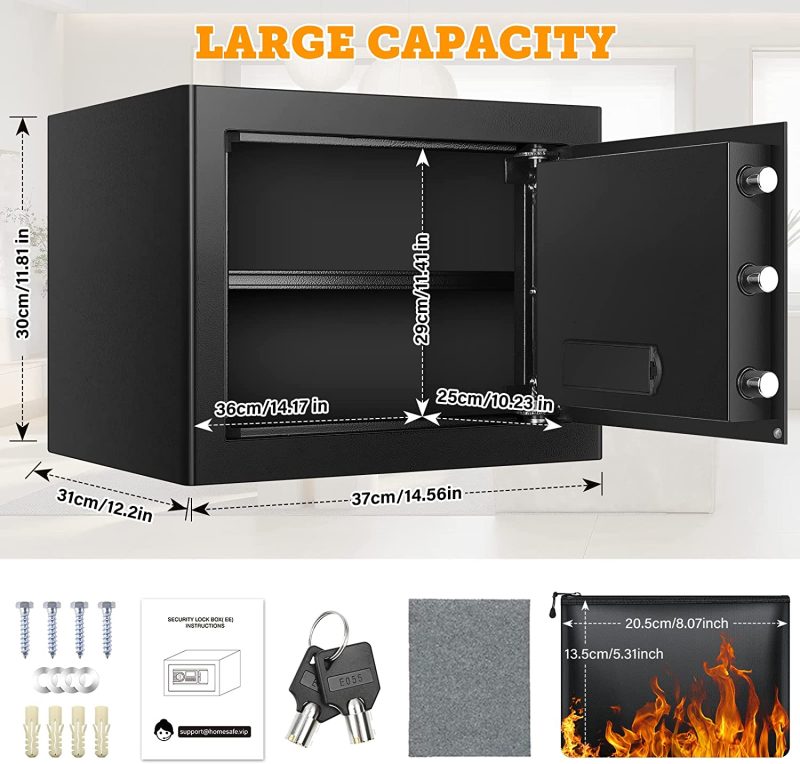 🔥【HOME SAFE BOX FIREPROOF WATERPROOF】Our home safe features 3 round live-locking bolts, seamless forming construction, and pry-resistant concealed hinges, provides long-lasting and reliable protection against forced entry. You use it to store sensitive documents, credit cards, medicine, gun etc., away from children or nosey visitors.