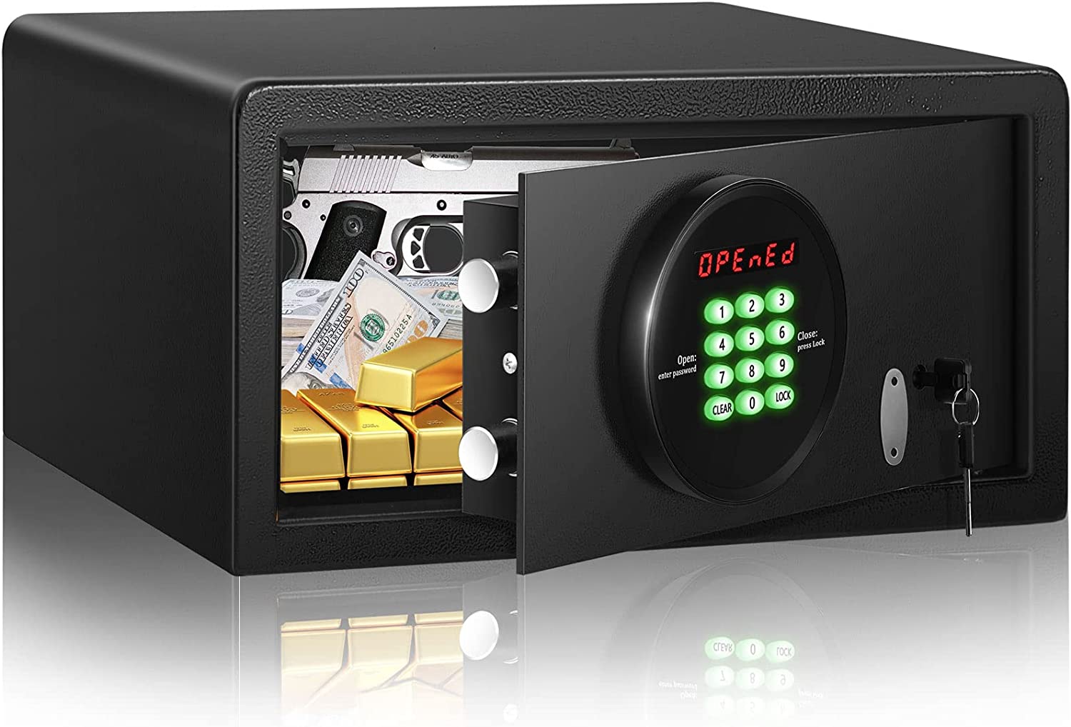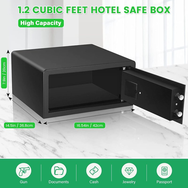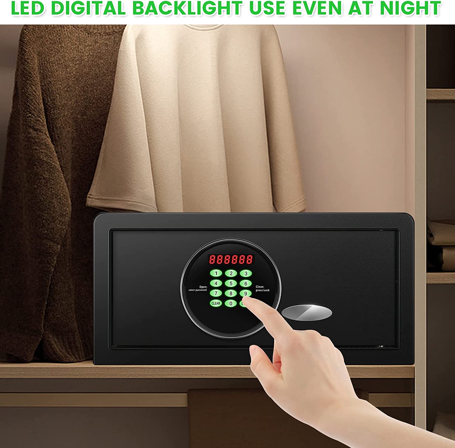 🔥🔥【LCD SCREEN & BACKLIT KEYBOARD】The advanced illuminated keypad and LCD display screen can make you see the password clearly in the night, increasing the probability of entering the correct password. The black sandstone exterior finish gives the safe a handsome look that will coordinate with any hotel,home or office setting for superior security.
